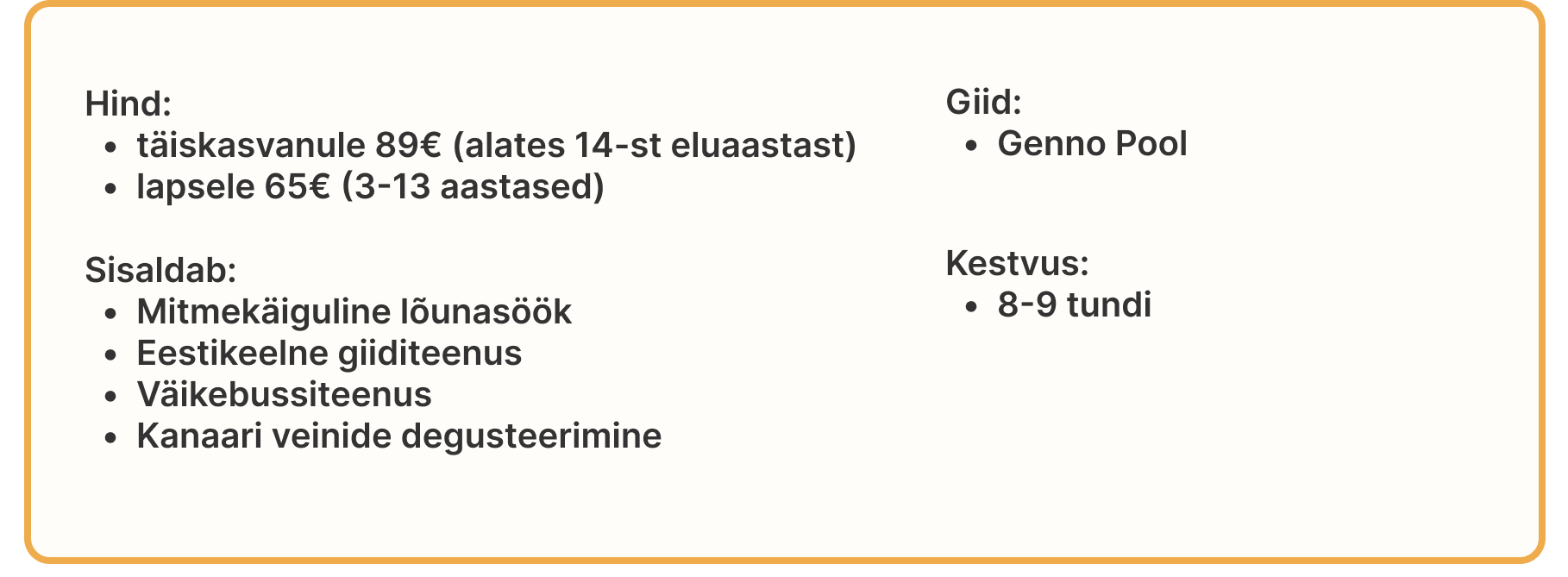 “Väga meeldis nende poolt korraldatud saare ringreis. Väga ägedad ja ilusad peatuspaigad, imehea lõunasöök, paraja suurusega reisiseltskond ja tore giid Genno. Ka lastel (4 ja 6 aastane) oli väga tore ja meeleolukas”