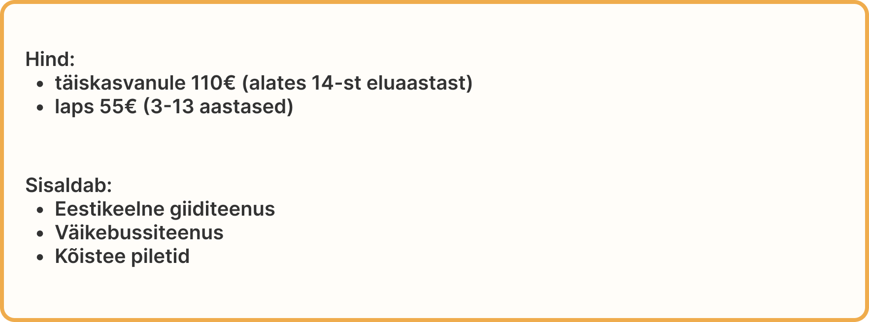 NB! Ekskursioon toimub minimaalselt 10 soovijaga ja ekskursiooni toimumisest anname teile teada minimaalse grupi täitumisel ja kinnitame tuuri toimumist köistee piletite olemasolul meili teel, hiljemalt 40h enne ekskursioonipäeva.